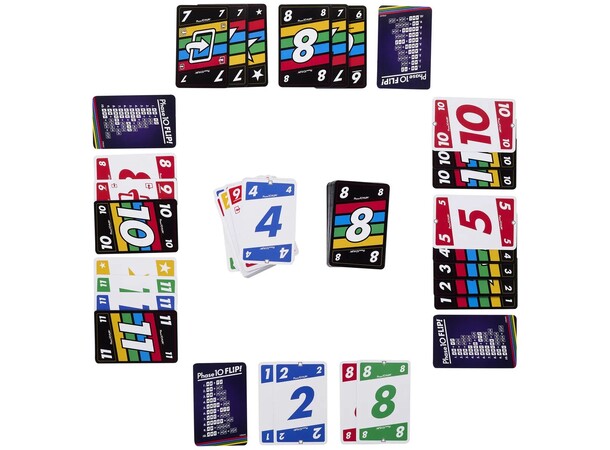 Phase 10 Flip tar det klassiske kortspillet du kjenner og elsker til et helt nytt nivå av spenning med dobbeltsidige kort og spillendrende flips! Kappløp gjennom 10 fargebaserte faser, byggesett, løp og mer - men se opp for Flip-kort som kan snu spillet på hodet på et øyeblikk.