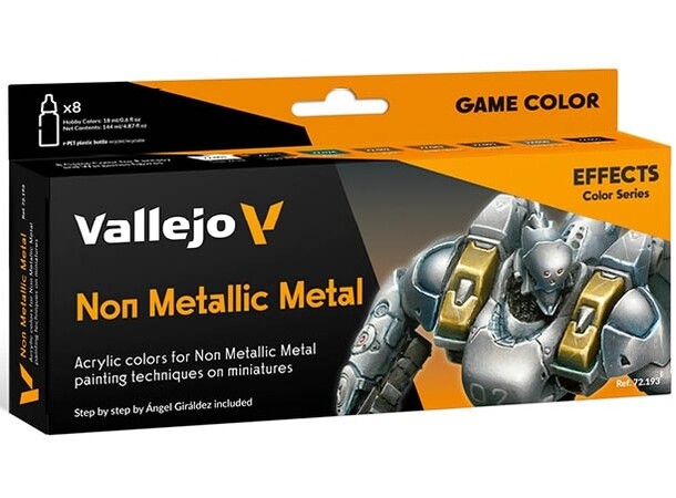 Vallejo Game Color Set Non Metallic Metal Game Color-sett med trinn for trinn av Ángel Giráldez for å oppnå metallutseende (gull og sølv) uten å bruke metalliske farger.