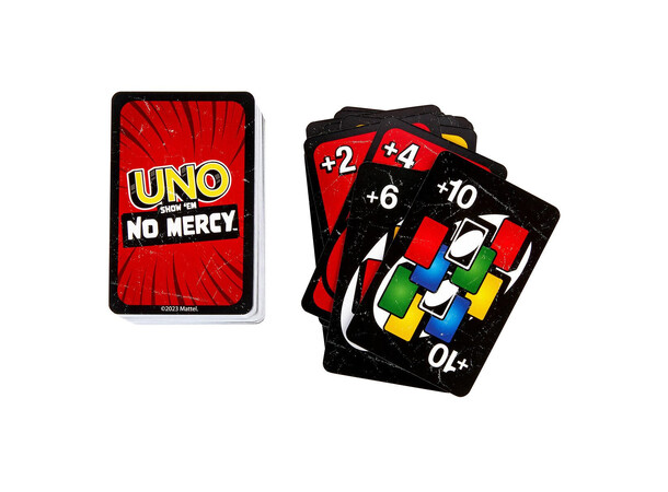 UNO Show 'em No Mercy är vårt mest brutala UNO-spel någonsin! Spelet innehåller många fler kort och MYCKET tuffare straff (vill någon dra tio kort?), och med de nya reglerna måste spelarna stapla, byta och dra fler kort än någonsin tidigare.
