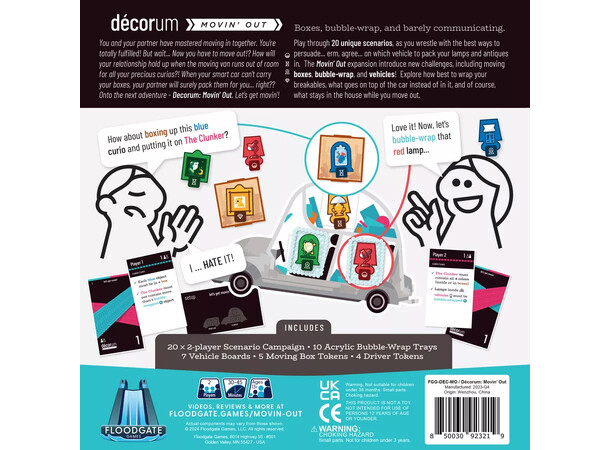Decorum: Movin' Out är en expansion till Decorum som introducerar nya utmaningar, inklusive flyttlådor, bubbelplast och fordon!