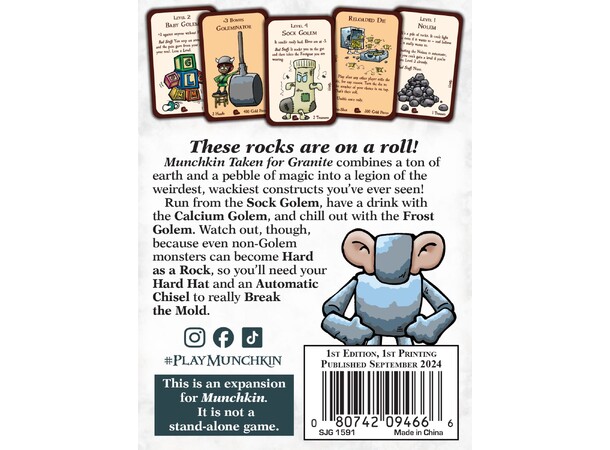 Munchkin: Taken for Granite kombinerar massor av smuts och en gnutta magi för att skapa en legion av de konstigaste och galnaste konstruktionerna du någonsin har sett! Spring från Sock Golem, ta en drink med Calcium Golem eller koppla av med Frost Golem. Men se upp, för även icke-Golem-monster kan bli stenhårda, så du behöver en hård hatt och en automatisk mejsel för att verkligen bryta formen.