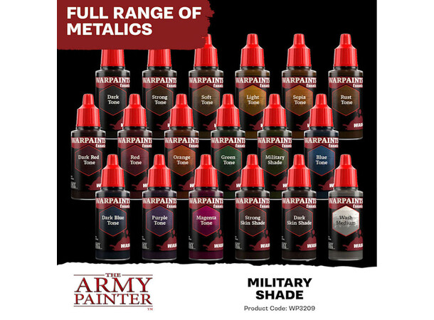 Army Painter Warpaints Fanatic Wash Military Shade (18ml) akrylmaling for alle typer Fantasy- og Wargame-figurer. Military Shade er en brungrønn wash som brukes til å legge på en skygge og forsterke detaljer på miniatyren.